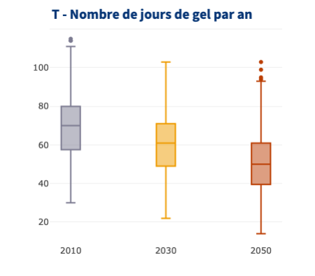 La baisse tendancielle du nombre de jour de gel par an devrait se poursuivre, pour passer d’une médiane à 70 jours de gel par an sur la période du passé récent à seulement de 50 jours de gel par an à l’horizon 2050, soit une baisse de près de 20 jours. Les années les plus extrêmes pourraient passer sous les 15 jours de gel par an.