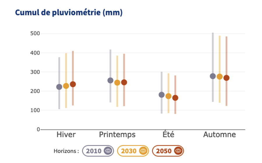 La figure ci-contre représente, saison par saison, l’évolution du cumul de pluviométrie (mm) entre le climat récent et celui attendu aux horizons 2030 et 2050 pour le point de grille sélectionné.