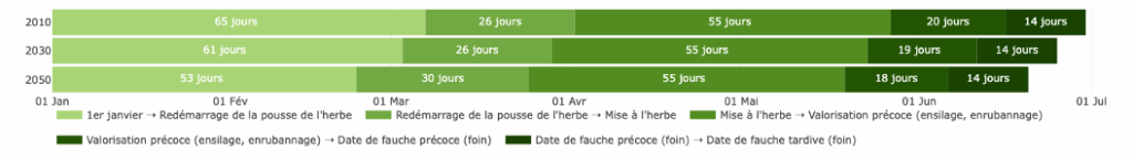 On observe un raccourssiement de près de 10 jours en moyenne du cycle de développement des prairies, avec une date de mise à l’herbe avancée de près d’une semaine à l’horizon 2050 par rapport au passé récent.