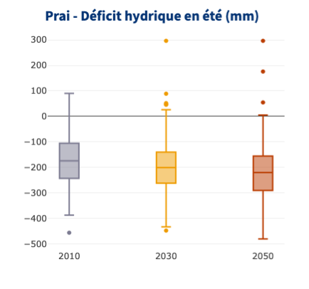 Le graphique ci-dessus présente Bilan hydrique en été (mm) entre le 1 juin et le 31 août. Pour l’horizon 2010, la médiane de l’indicateur est -174 mm et elle évolue à -220 mm pour l’horizon 2050. On observe donc une tendance à l’augmentation du déficit hydrique estival avec des valeurs extrêmes pouvant atteindre les -450mm.