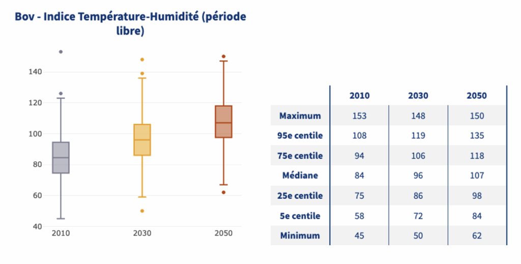 On observe donc une hausse du nombre de jours par an situation de stress thermique (ITH>68) pour les brebis, passant d’une médiane de 84 jours dans le passé récent à 107 à l’horizon 2050, soit une hausse de plus de 20jours. Les années les plus extrêmes peuvent atteindre les 150 jours en situation de stress thermique.
