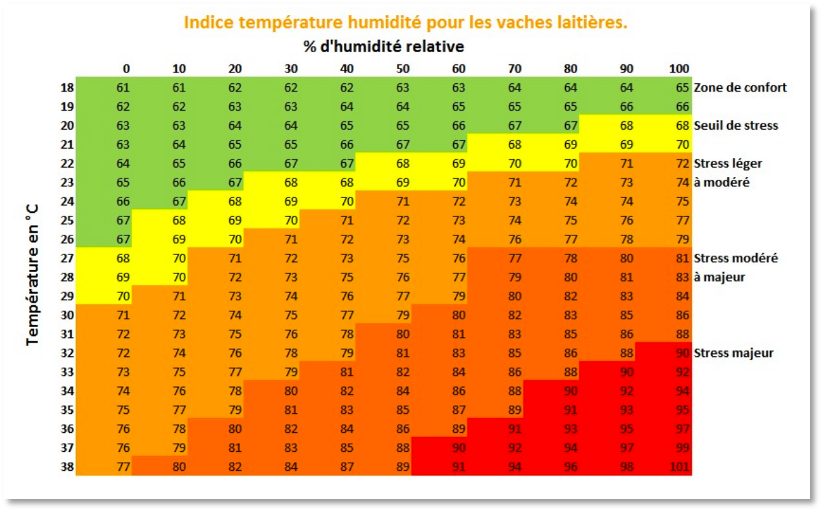 Au-delà d’une valeur de 68, correspondant par exemple à une température de 22°C avec une humidité de 50%, les ruminants subissent déjà un stress léger ayant des impacts sur leur production.
