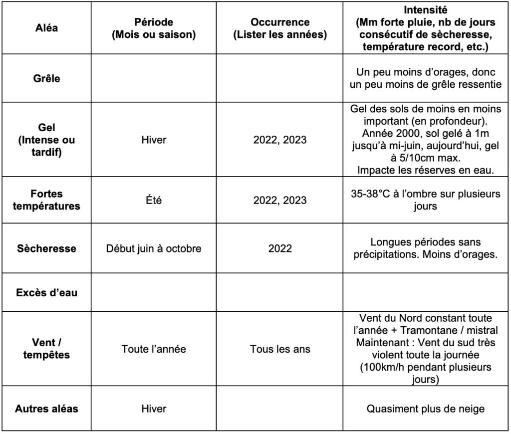 Il s’agit de caractériser la vulnérabilité de la ferme aux aléas climatiques et ses leviers d’adaptation.