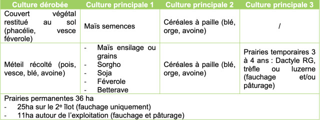 Les cultures de printemps qui suivent l’implantation du méteil en dérobé sont diverses (maïs, sorgho, soja, féverole, betterave…). Les surfaces de chacune de ces cultures et leur répartition sur les parcelles évoluent en proportion relative d’une année sur l’autre.